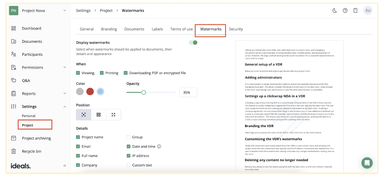 To strengthen security, data room providers strongly recommend applying watermarks to all documents, especially if you prepare virtual data room for an M&A due diligence process.