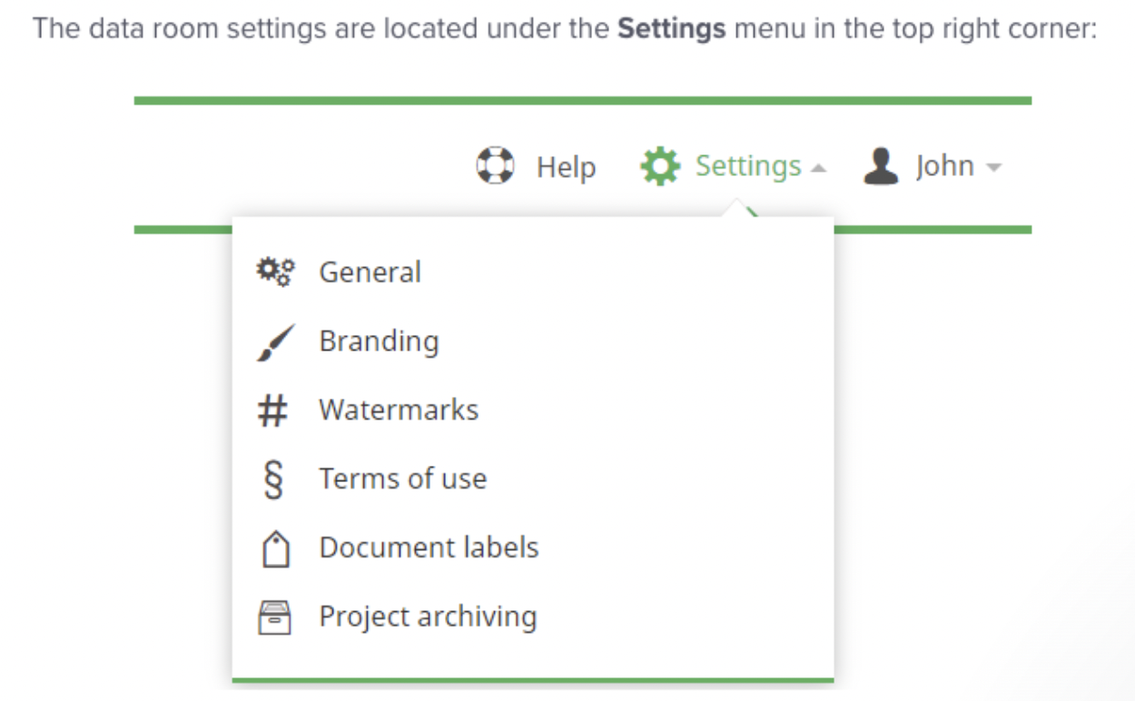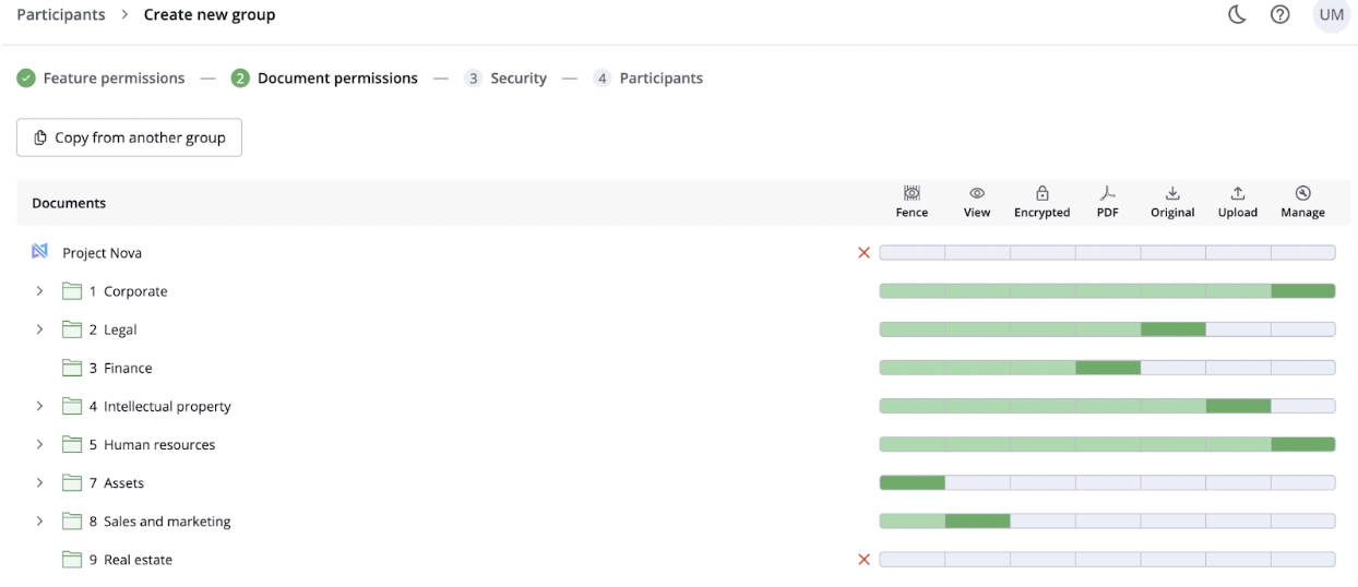 Granular user permissions | The permission settings allow administrators to define specific data room access levels for each user. |